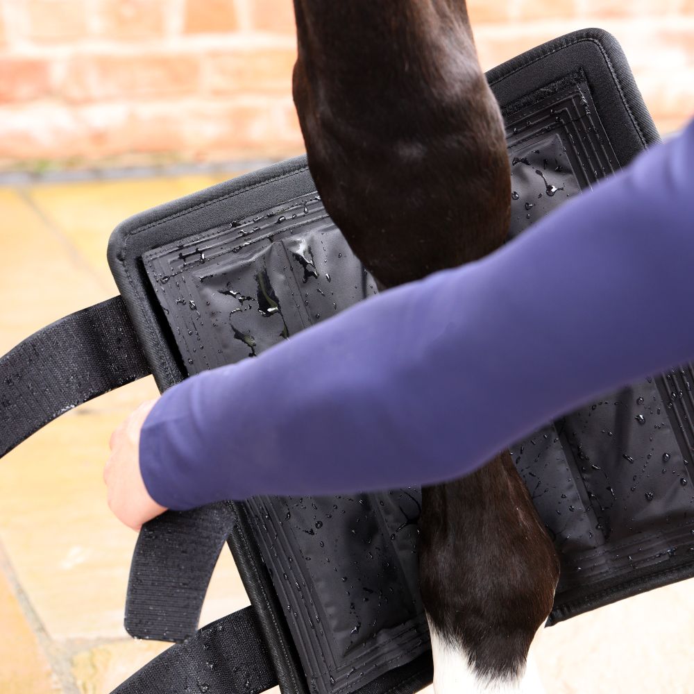 Mångsidiga terapeutiska bandage för behandling av ligament och senor på hästens underben. Kan användas både varma eller kalla som stöd för snabbare återhämtning efter hård täning eller tävling. Bekväm neopren med bundna kanter och breda kardborreknäppen ger en nära och bekväm passform. Gelförpackningar säkras på insidan med kardborrefästen. Lämplig för användning på fram eller bakben. Säljes i par.