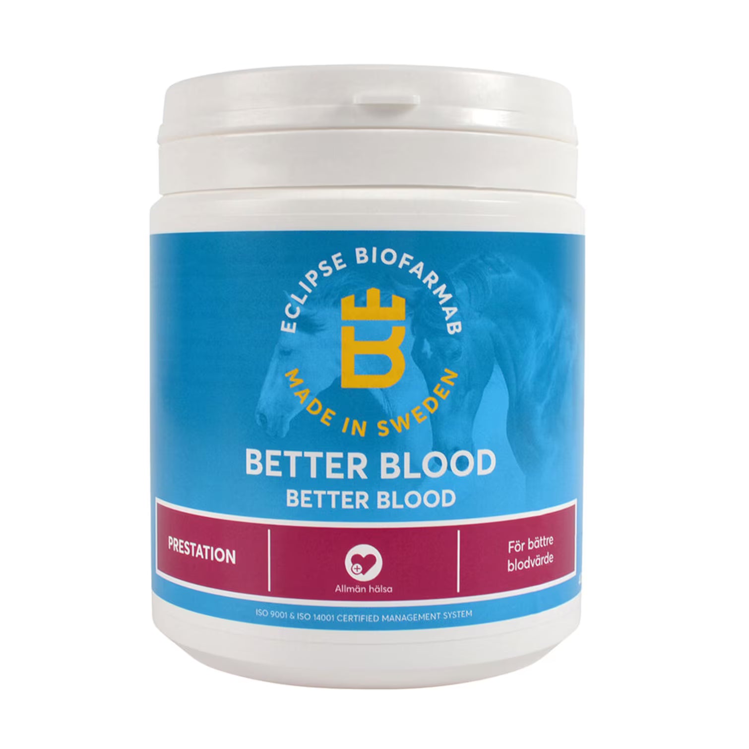 När man vill förbättra hästen blodvärde kan man antingen tillföra extra järn eller tillföra näringsämnen som underlättar järnupptaget från det dagliga fodret och medverkar vid nybildningen av röda blodkroppar.För hårt tränande hästar är den sistnämnda att föredra! Better blood innehåller vitamin B12, folsyra och Inulin.