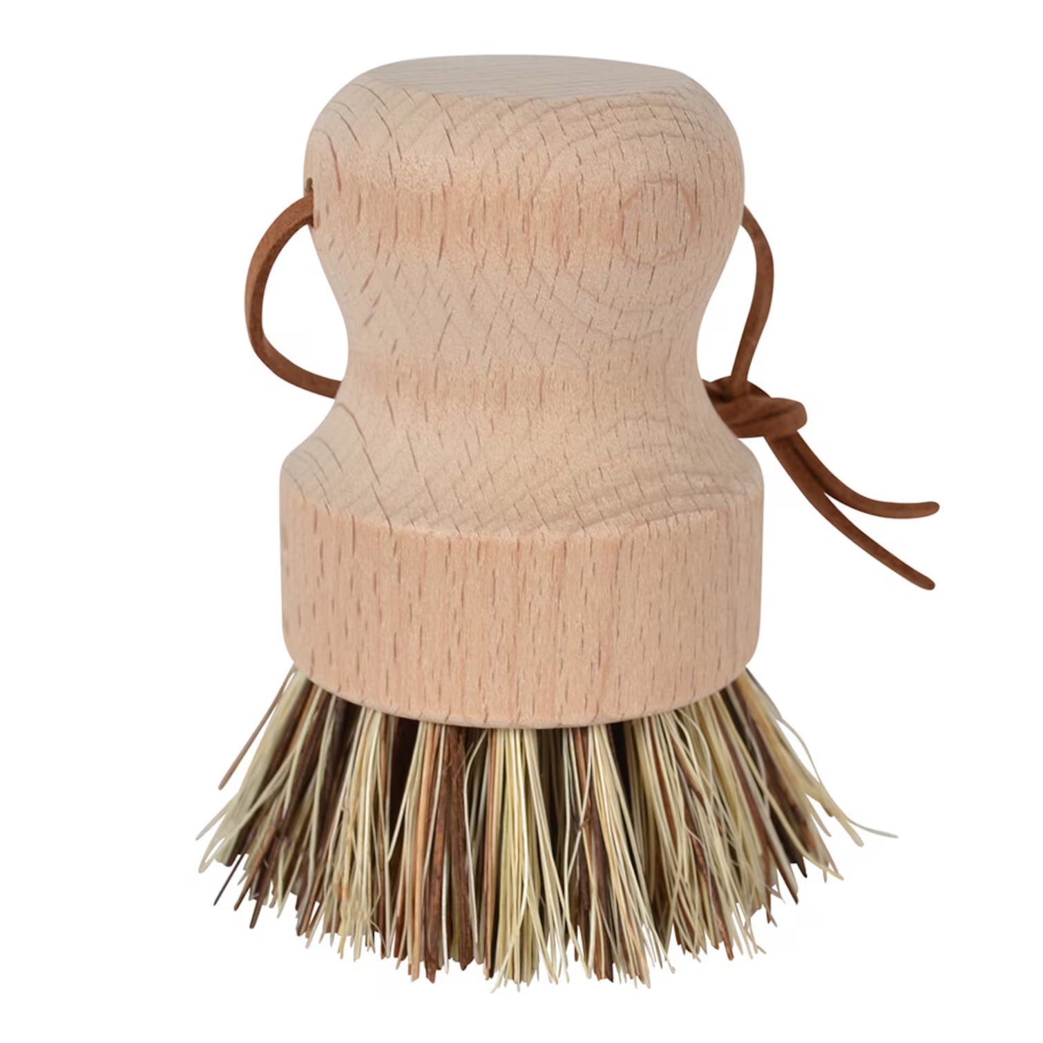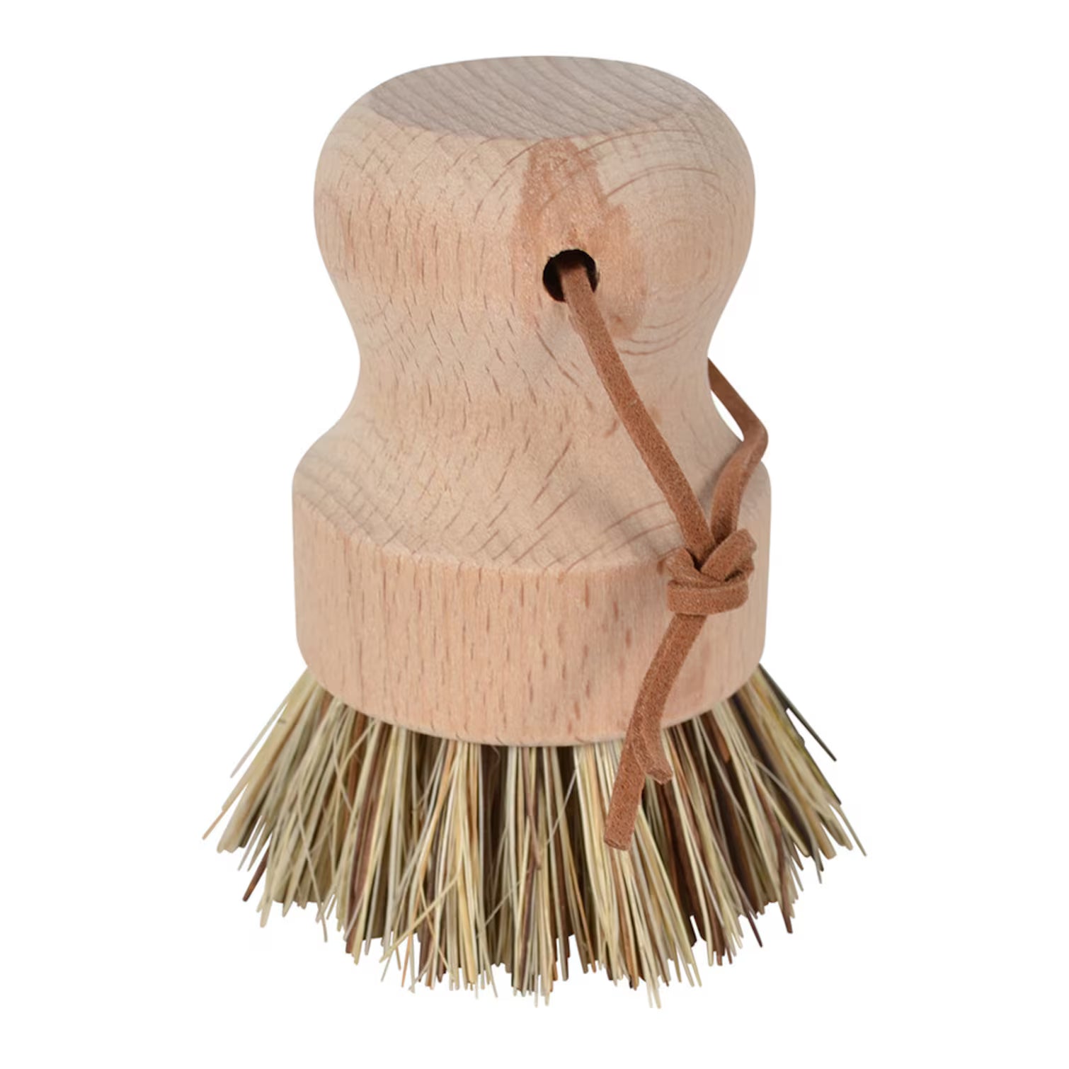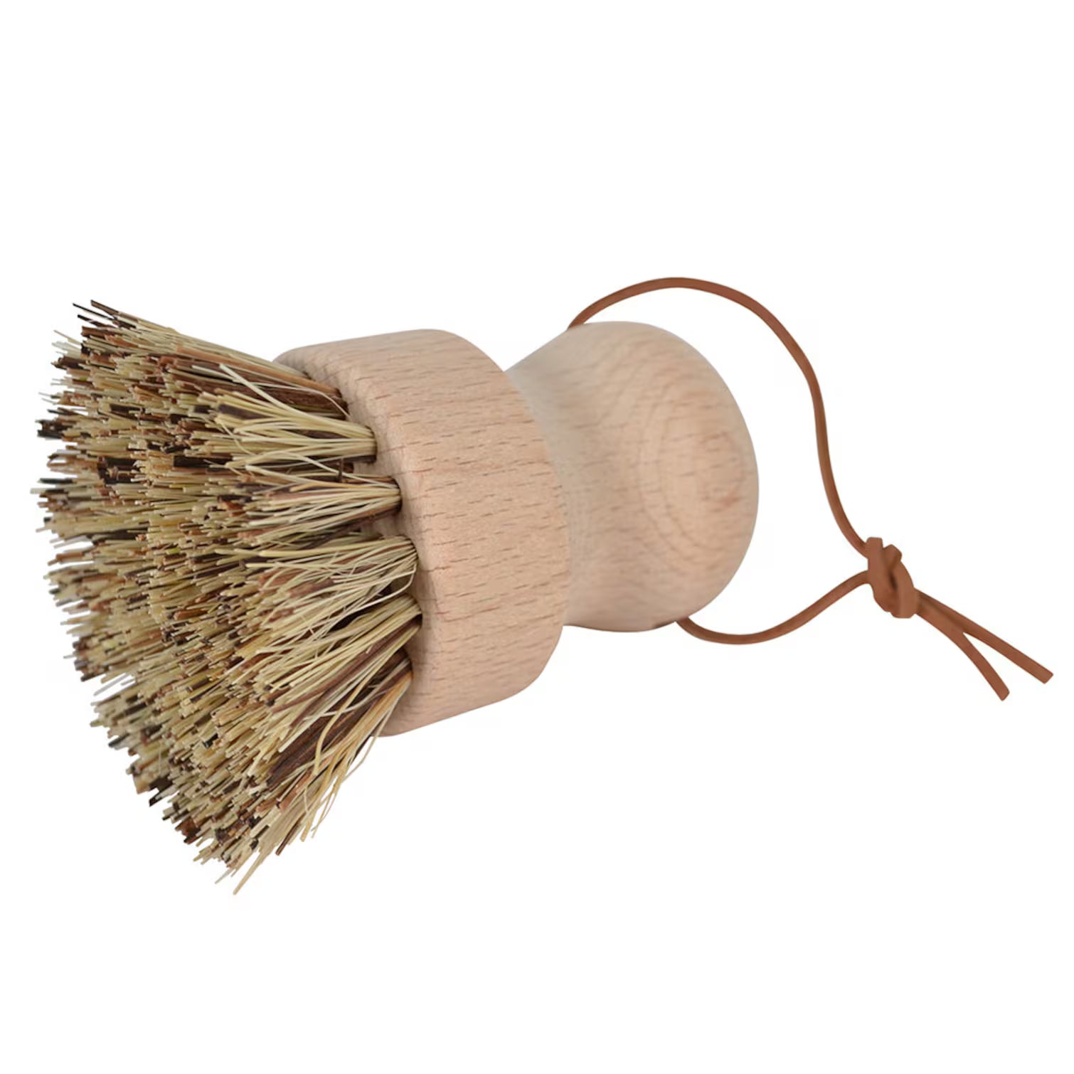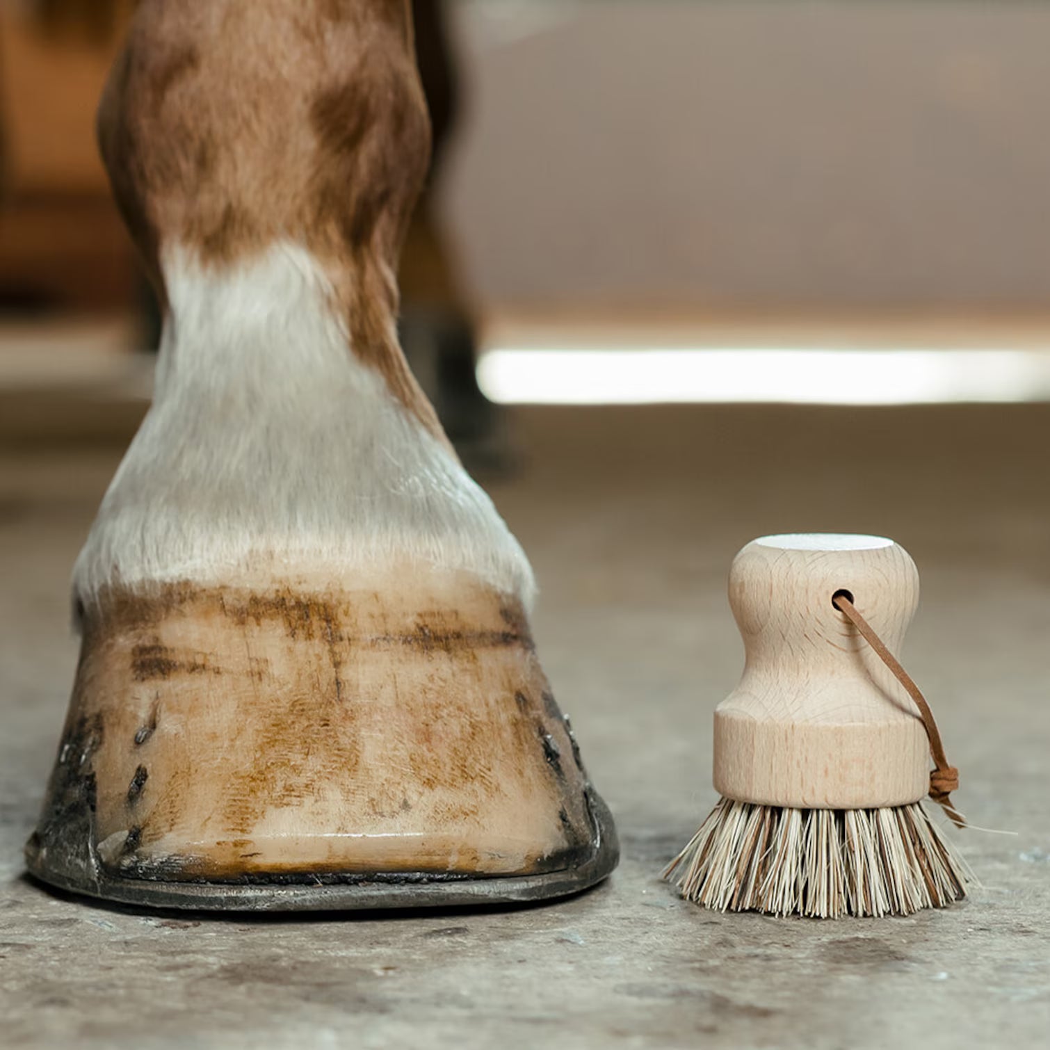 Rund hovborste med trärygg, designad med dekorativ läderrem för upphängning. Perfekta hjälpmedlet för att på bort ridhussand från hovarna eller vi rengöring av stigbyglar. Borst av Unionmix.
