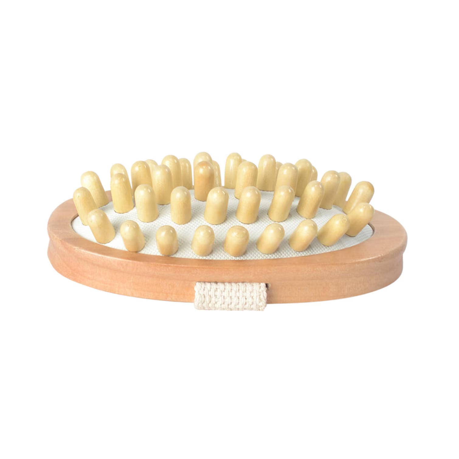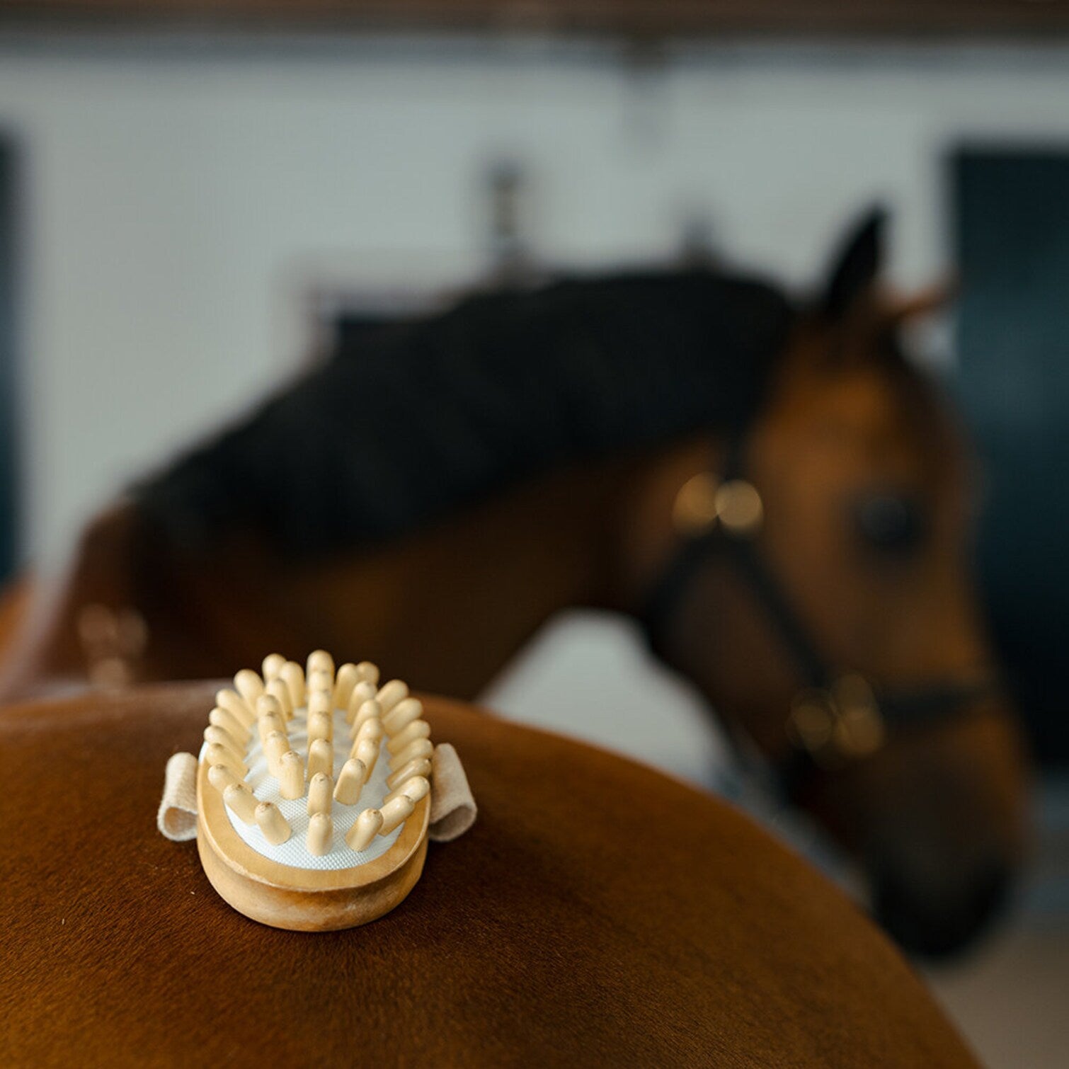 Greppvänlig massageborste tillverkad av bokträ med träknoppar på gummibas. Massageborsten kan med fördel användas för att massera ut liniment på hästens stora muskelgrupper.