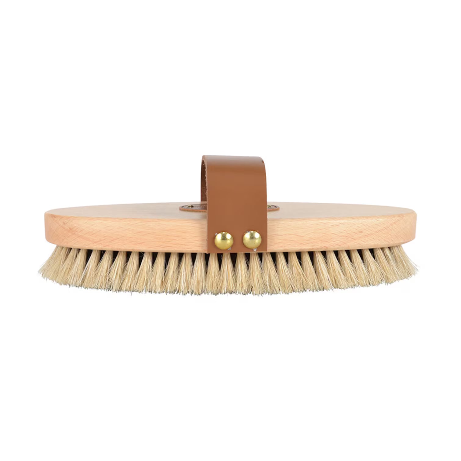 Ryktborste med rygg av bokträ och borst av 100% tagel. Designad med en greppvänlig läderrem.