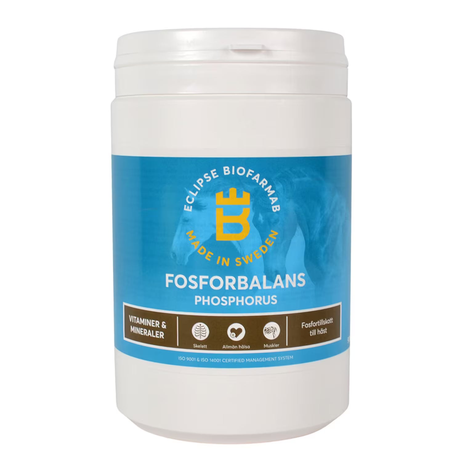 Eclipse Biofarmab Fosforbalans är ett rent fosfortillskott som effektivt balanserar foderstater med underskott av fosfor, exempelvis vid utfodring med kalkrikt stråfoder eller små mängder havre. Fosfor är, tillsammans med kalcium, ett av de viktigaste mineralerna för hästar och spelar en central roll i skelettets och tändernas styrka samt i energiomsättningen. Förhållandet mellan kalcium och fosfor i foderstaten är avgörande och bör hållas i en balans mellan 1,2:1 och 1,8:1. Fosforbalans säkerställer att din häst får rätt mängd fosfor för att upprätthålla en stark benstomme och optimal hälsa, särskilt vid tillväxt, träning eller kalkrik utfodring.