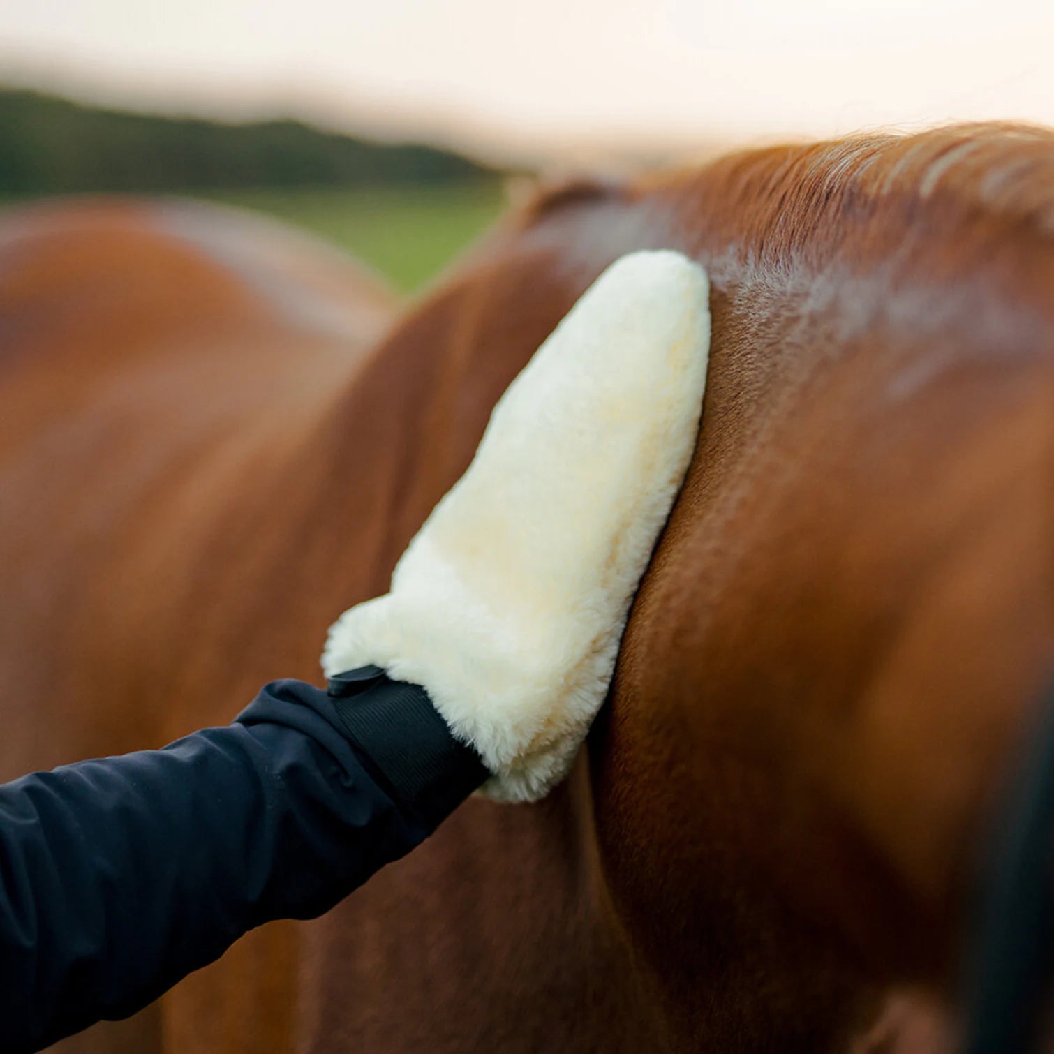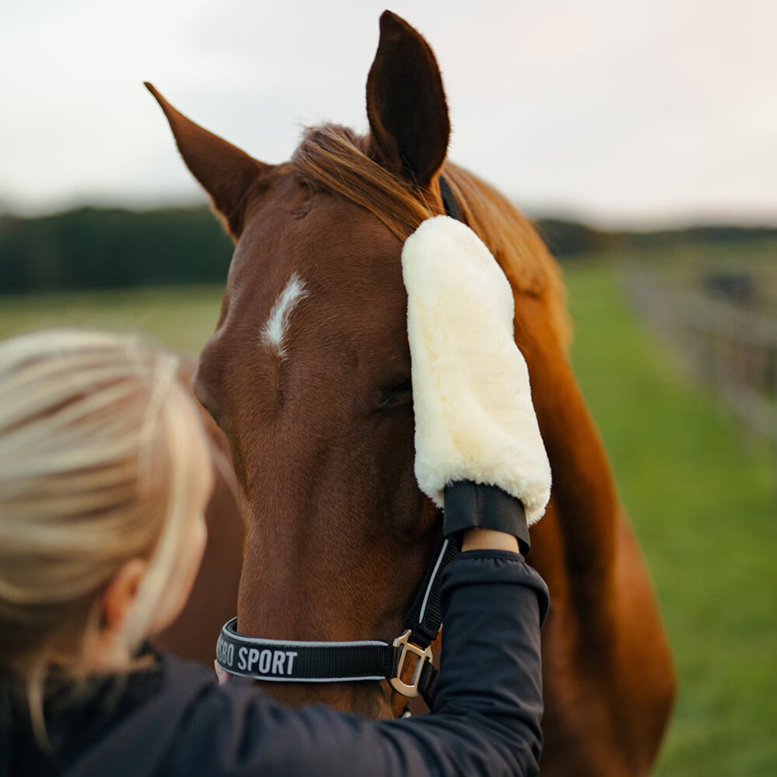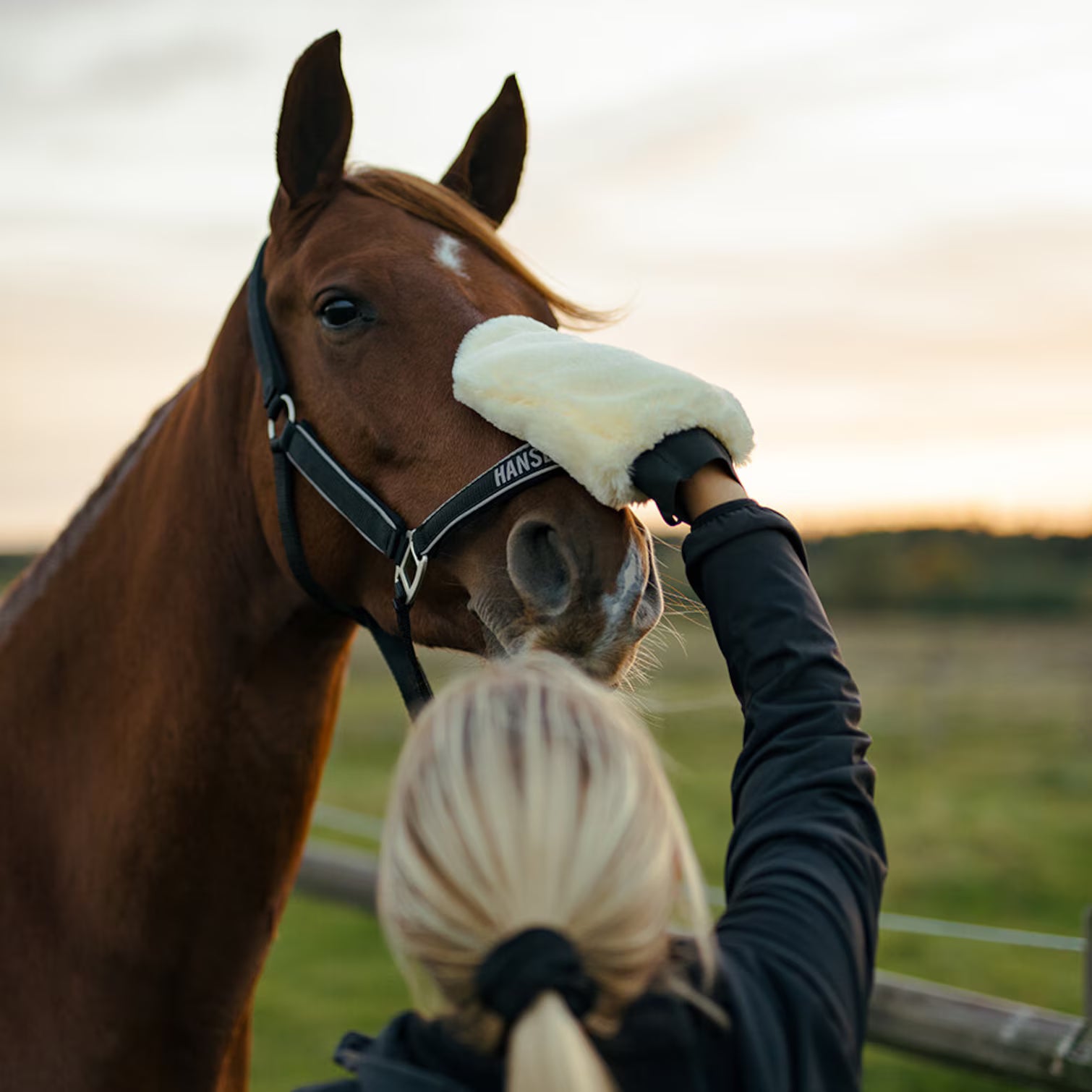 Hansbo Sport Grooming vante / handske. Otroligt mjuk dubbelsidig putsvante av artificiellt fårskinn, perfekt för att avlägsna damm från hästen och för att ge den sista finishen. Designad med ett elastiskt band nertill för optimal komfort och användarvänlighet. Kan tvättas i maskin 30 grader. One size.