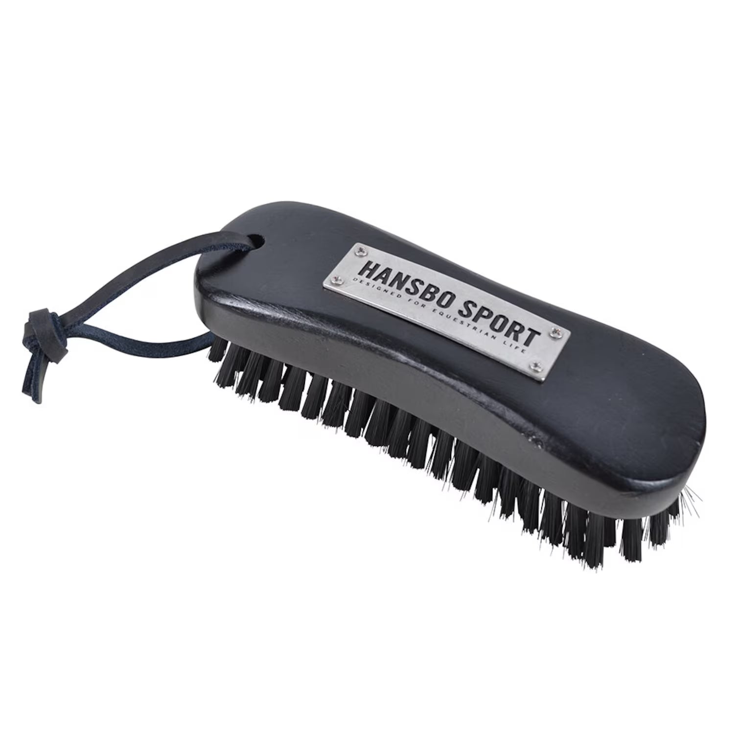 Greppvänlig ergonomiskt utformad pannborste med mjuka borst i konstmaterial, rygg i svartlackerat trä och läderhandtag, praktiskt för upphängning.
