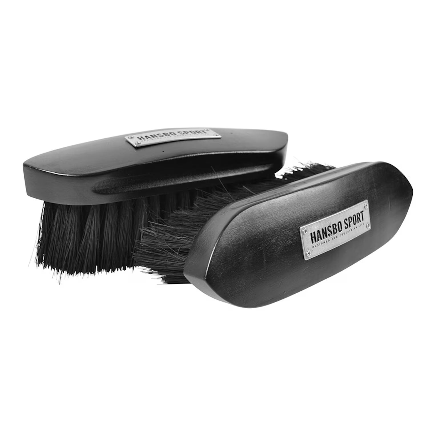 Rotborste i svartlackerad trärygg. Supermjuk borst av hästtagel. Fastskruvad dekorativ HANSBO SPORT-metallbricka.