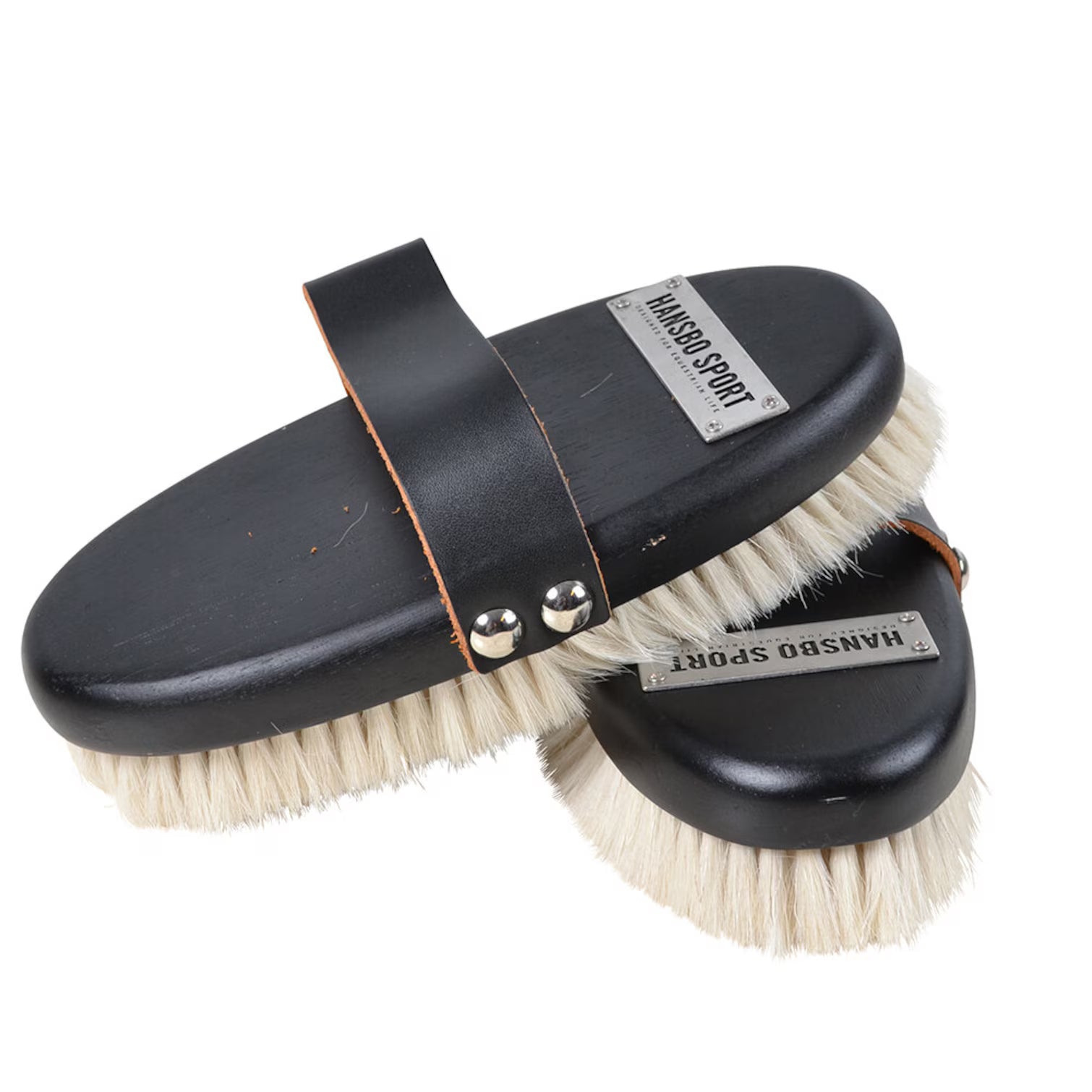 Exklusiv ryktborste med 50% gethår 50% syntetborst. Rygg i svartlackerat trä och läderhandtag. Ger en blank och fin päls. Fastskruvad dekorativ HANSBO SPORT-metallbricka.