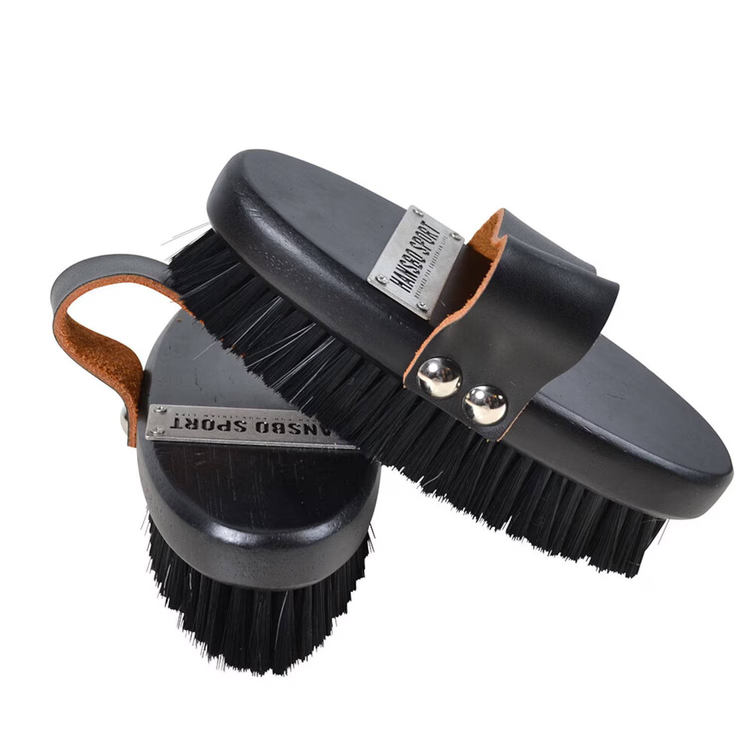 Ryktborste med tjockt artificiellt hår med rygg i svartlackerat trä och läderhandtag. Plastborsten minimerar ansamlingen av bakterier. Ger en blank och fin päls. Fastskruvad dekorativ HANSBO SPORT-metallbricka