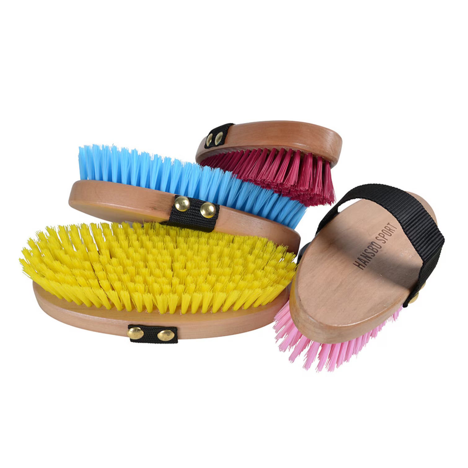 En trevlig liten borste med lackad trärygg. Borsten säljs i mixade färger och med handrem i svart nylon.