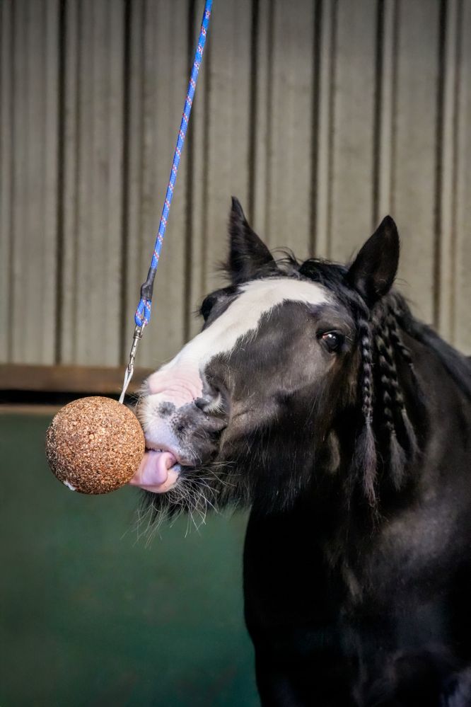Den populära stallbollen kommer här i en ny sammansättning med låg socker- och stärkelsenivå för den känsliga hästen. Perfekt att använda för stimulans och aktivitet hos den rastlösa hästen i boxen, i hagen eller på tävlingsplatsen. Häng upp och låt bollen hänga fritt.