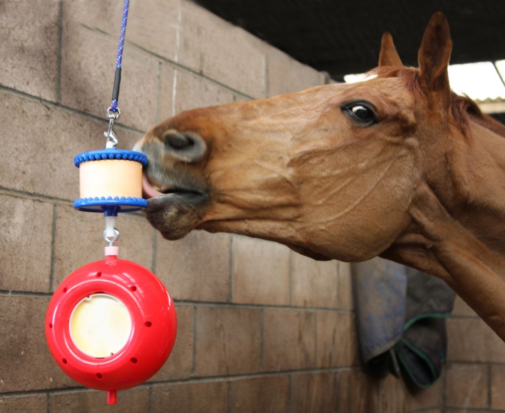 INNAN UPPHÄNGNING: Låta hästen bekanta sig vid leksaken, få smaka på slickstenen så att hästen förstår vad produkten innebär innan den hängs upp i boxen.