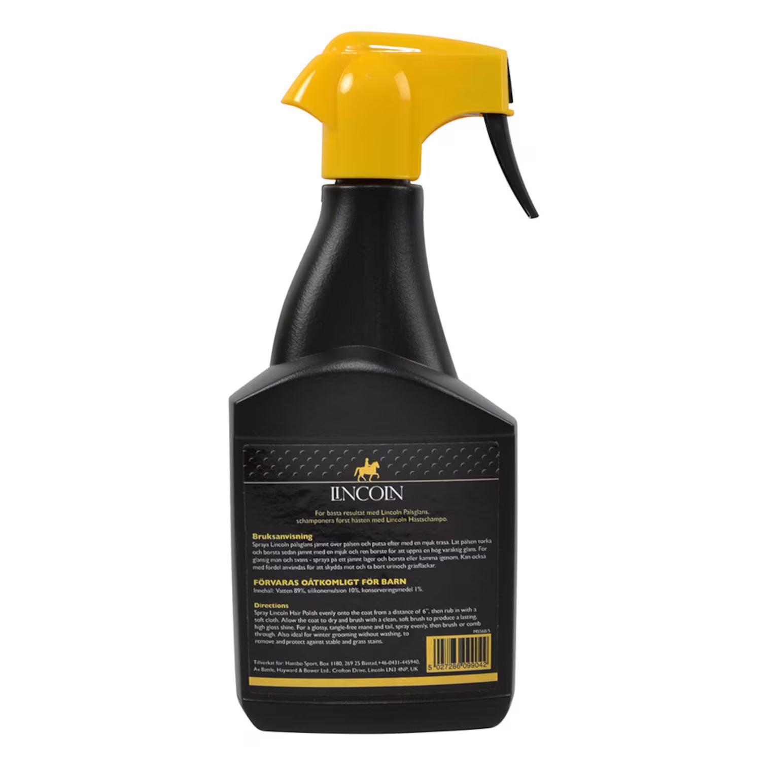Lincoln pälsglans bibehåller strukturen och vitaliteten i pälsen, vilket medför en mycket enklare ryktning. Sammansättningen i produkten ger ett exceptionellt silkesblankt intryck, som varar länge. Kan med fördel också användas för att skydda moturin- och gräsfläckar. Sprayhuvud ingår.