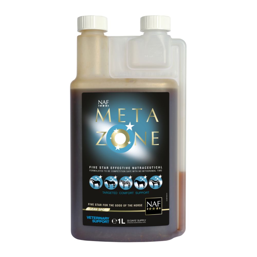 Metazone är ett effektivt femstjärnigt tillskott för hästar som behöver lite extra stöd. Metazone har en synergistisk sammansättning av ingredienser som främjar komfort genom hela hästens kropp. De växtbaserade fytokemikalierna i produkten ger stöd för kroppens egna naturliga återhämtningsprocess, oavsett om det är i leder, hovar, senor, ligament, muskler eller hud. Produkten är karensfri, och kan ges dagligen eller vid behov för att bibehålla hästen ”In the Zone”. NAF Metazone finns tillgänglig i två snabbverkande varianter; i flytande form och som en oral spruta.