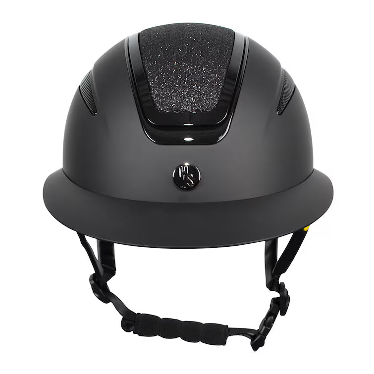 Hansbo Sport Mips Air Matte Ridhjälm. Matt finish, elegant bred matt solskärm, glittrande panel kantad av stilfulla cromade ramar. Utrustad med fyra funktionella ventilationsöppningar. Justerbart hakband med detaljer av syntetiskt läder och praktiskt snabbspänne. Avtagbart vadderat innerfoder av Cooldry - material, torkar snabbt och håller huvudet svalt under hela ridpasset. Justerbart huvudband för optimal passform. Godkänt enligt senaste EU standarden EN 1384:2023, samt godkänd enligt CE.