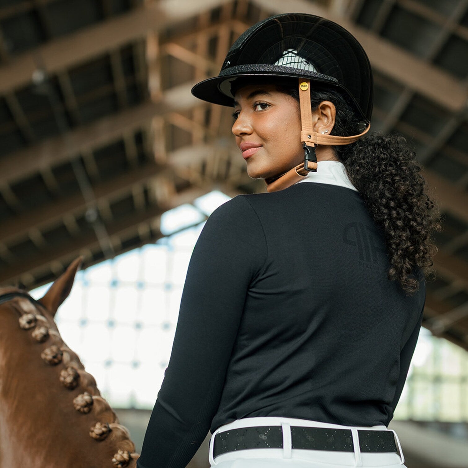 Ridhjälm med implementerat Mips-system. Elegant glansig hjälm med bred solskärm och gnistrande glittrande panel samt vackert glitterband runt skärmen. Designad med totalt sex ventilationsöppningar. Justerbart hakband i exklusivt brunt konstläder med trepunktsfästen samt snabbspänne. För optimal passform justeras storleken enkelt baktill med hjälp av rattsystemet. Avtagbart innerfoder av Cooldry-material, som torkar snabbt och håller huvudet svalt. Tillverkad av premium polykarbonat och utrustad med innovativt integrerat nässkydd. Godkänd enligt Mips, CE samt standard EN1384:2023.